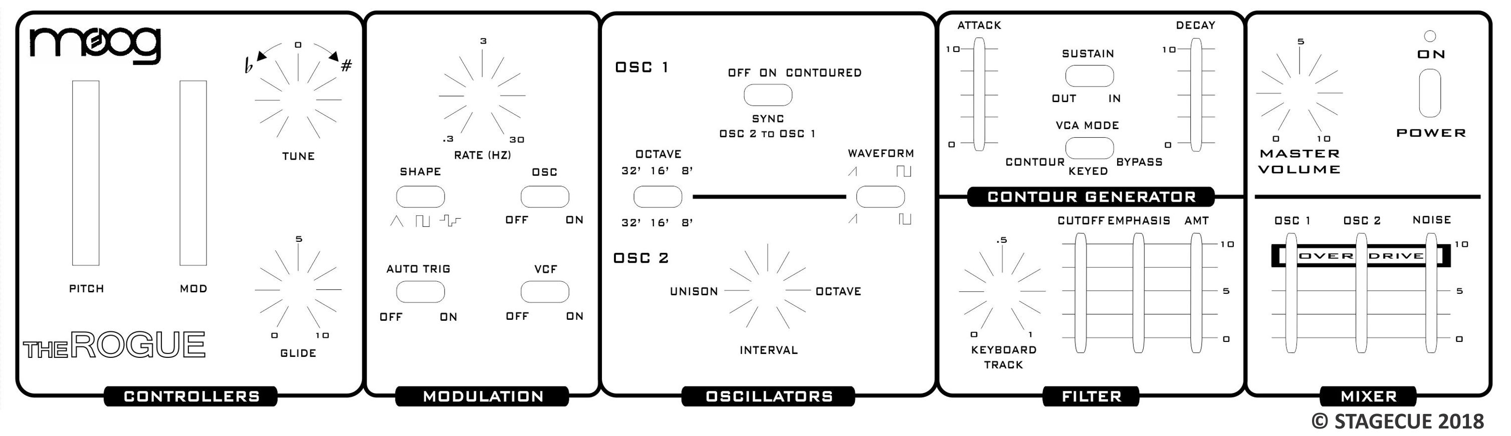 The MOOG© ROGUE is the sister to the Taurus II Bass Pedals... They share the same sound engine. This synth has all of the key Moog synth features... 24dB/octave ladder filter, dual analog VCO's, VCO overdrive, random pink noise source, etc. and is capable of some gnarly, fat, analog synth goodness.